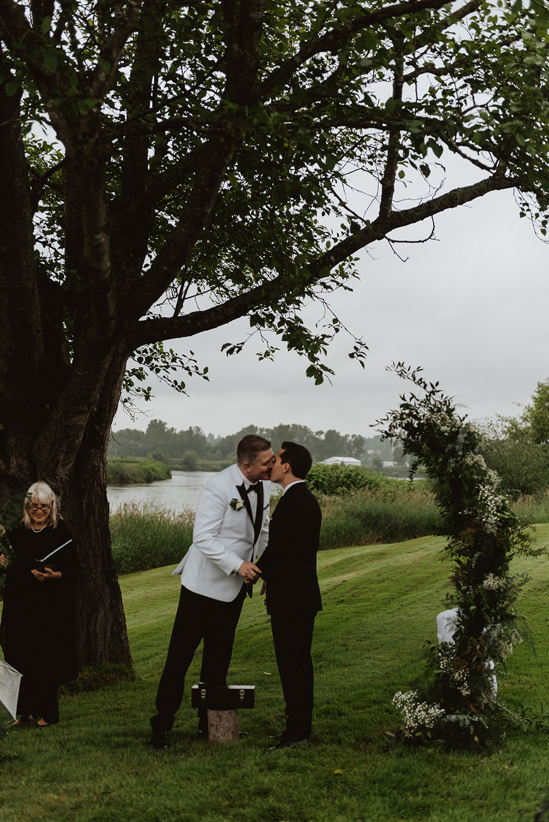 Greg & Davis got married at Pemberton Farm in June 2022, almost two years after their original wedding date. After waiting so long, they were finally able to celebrate with their family and friends on this classic Seattle spring day. These two were inspired by the stunning green landscape of Pemberton Farm, chic black and white accents, and masculine, textured florals. They wanted to ensure we didn't distract from the stunning river view for their ceremony, while also having some statement pieces to stand out. We loved working mostly with texture in a monochromatic palette for these classic, chic florals. We were so honored to work with these two across two years to make this gorgeous spring wedding a reality.